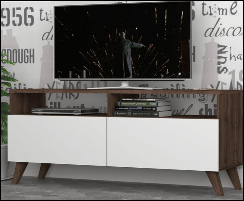 Design : Finition bicolore avec pieds compas vintage. Dimensions : 120 *35 * 50 cm Rangement : 2 niches ouvertes + 2 grands placards invisibles.